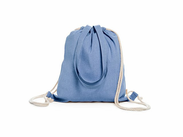 Рюкзак-мешок из переработанного хлопка плотностью 140 г/м² с меланжевой отделкой, ручками длиной 70 см в тон и шнурками натурального цвета.