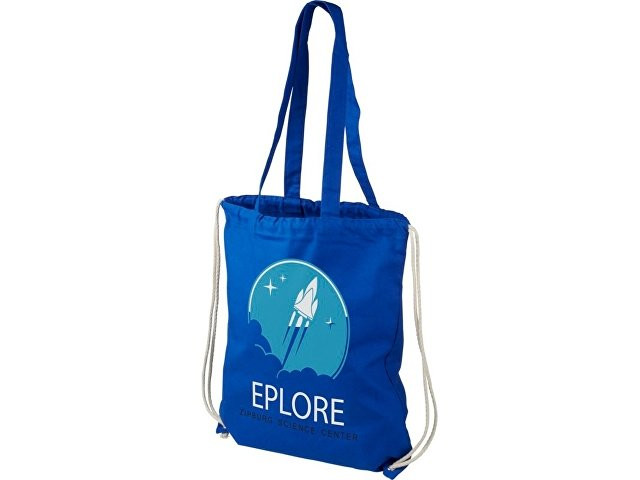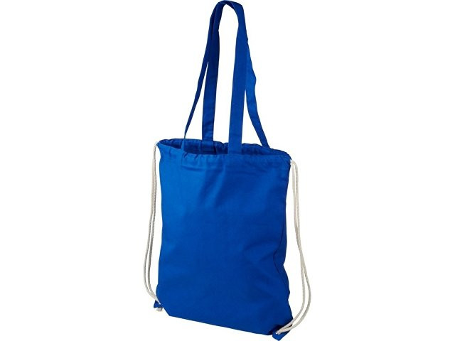 Многофункциональный хлопчатобумажный мешок с длинными ручками и затягивающим шнурком, который можно носить в качестве сумки для покупок или рюкзака. Большой основной отсек, закрывающийся затяжкой шнурка. Имеет две выпадающие ручки длиной 31 см. Вместимость: 16 л, выдерживает до 5 кг веса. Хлопок, 240 g/m2.