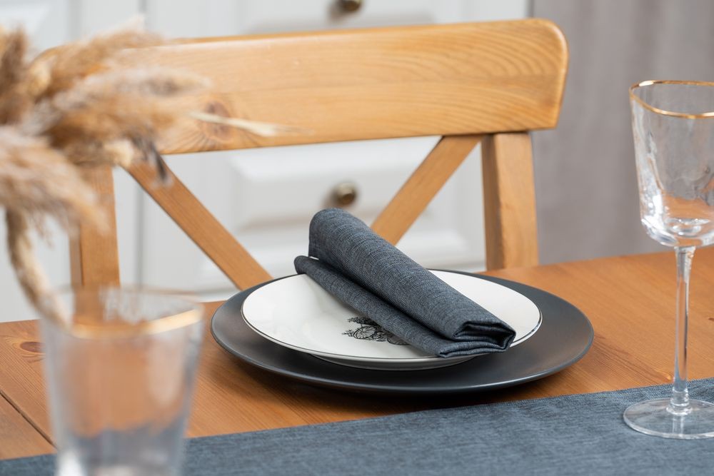 Износостойкая ткань, имитирующая лен, обработана пропиткой от грязи и воды, что делает ее применение для кухни и дома практичным, а уход — легким.