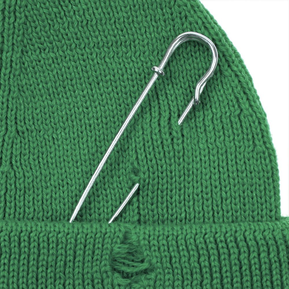 Однослойная шапка бини с рваным отворотом и металлическими аксессуарами для дерзких образов в любом возрасте. Яркий и запоминающийся акцент в стиле гранж.