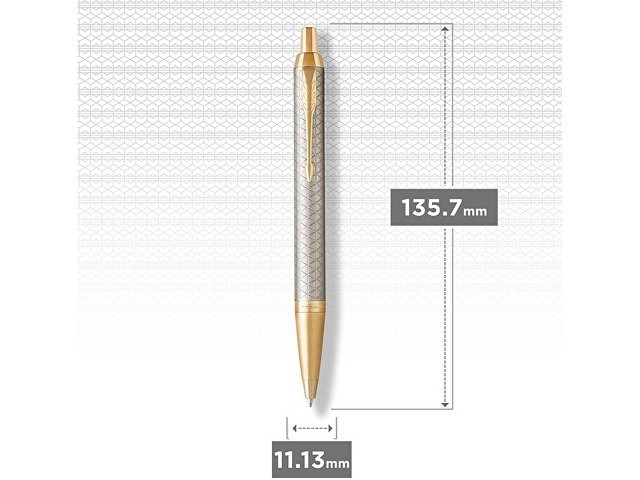 Серебристый матовый анодированный алюминий, прошедший пескоструйную обработку, прекрасно сочетается с оригинальными и актуальными гравированными графическими узорами. Дизайн дополнен позолоченными декоративными элементами. Ручка упакована в подарочную коробку Parker.