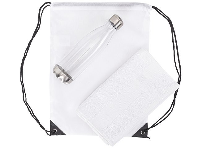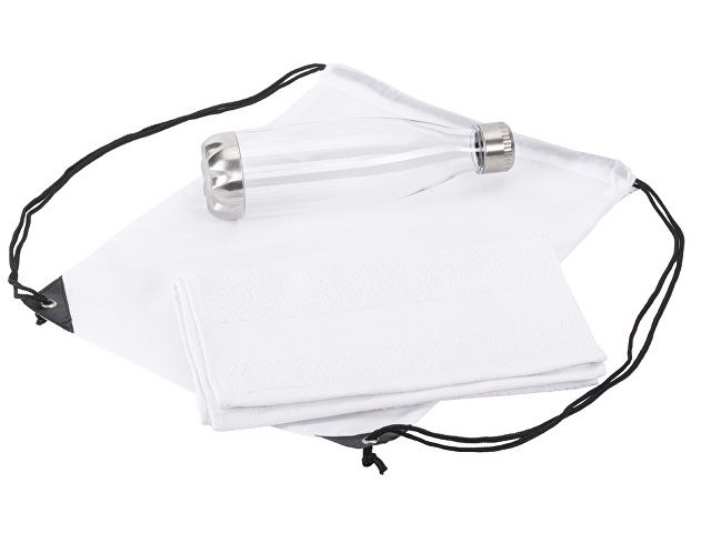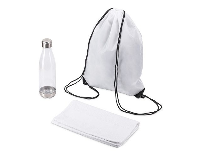 Универсальный спортивный набор будет актуален в любом виде спорта. Бутылка для воды позволит брать с собой не только воду, но и тонизирующие напитки или коктейли и поможет освежиться в любой момент. Тритан, из которого изготовлена бутылка, не искажает вкус и запах напитков, являясь абсолютно безопасным для человека. Натуральное полотенце из 100% хлопка не вызовет аллергии и не навредит коже. Вместительный рюкзак пригодится, чтобы всегда держать под рукой всё необходимое для тренировки. • объём бутылки: 700 мл • размер полотенца: 30х70 см • практичный набор для спортивного мерча
