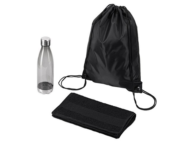 Универсальный спортивный набор будет актуален в любом виде спорта. Бутылка для воды позволит брать с собой не только воду, но и тонизирующие напитки или коктейли и поможет освежиться в любой момент. Тритан, из которого изготовлена бутылка, не искажает вкус и запах напитков, являясь абсолютно безопасным для человека. Натуральное полотенце из 100% хлопка не вызовет аллергии и не навредит коже. Вместительный рюкзак пригодится, чтобы всегда держать под рукой всё необходимое для тренировки. • объём бутылки: 700 мл • размер полотенца: 30х70 см • практичный набор для спортивного мерча