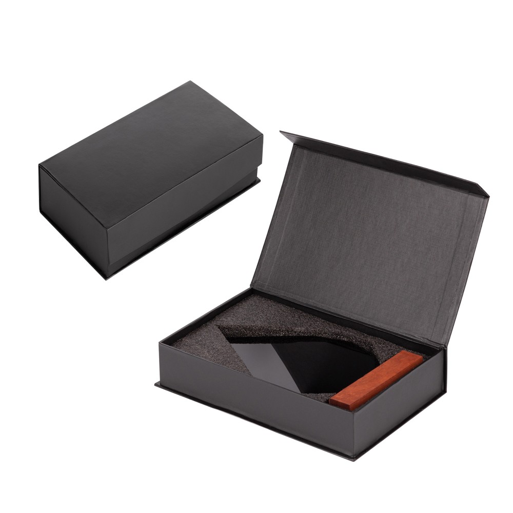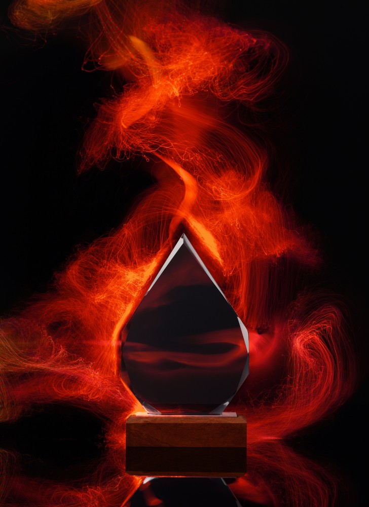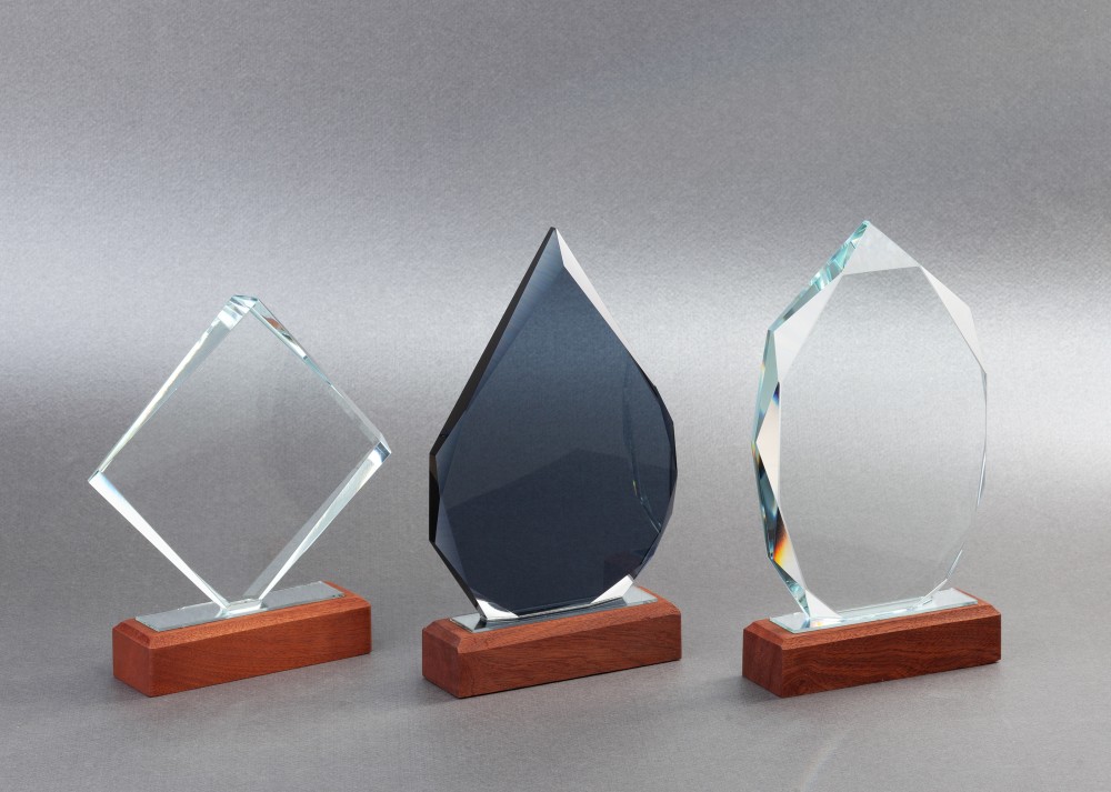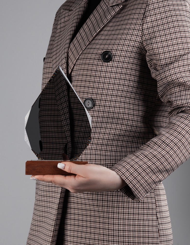 «Капля» представлена в тёмном стекле, на подставке из натурального дерева (палисандр), с возможностью персонализации на стекле или шильде. Символичное напоминание о личном вкладе в большое (общее) дело.