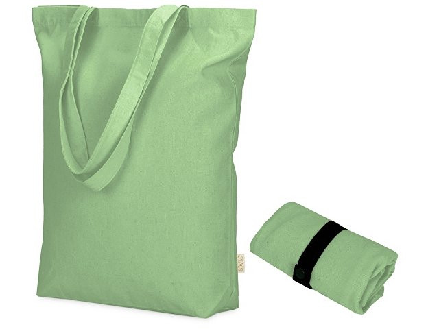 Удобная сумка-шоппер из переработанного хлопка. Можно хранить в сложенном виде и фиксировать с помощью эластичной ленты, застегивающейся на кнопку.