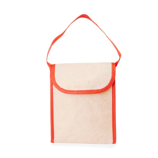 Сумка-холодильник из ламинированной бумаги с алюминиевой изотермической подкладкой и 2 мм изоляционной пеной. Ручка 60 см и клапан с застежкой-липучкой. Сумка и ручка имеют отделку соответствующего цвета.
