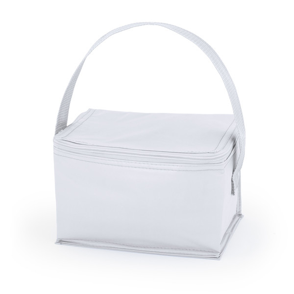Сумка-холодильник с подкладкой из изотермического алюминия на 6 банок. Внешняя поверхность из полиэстера. Ручка для переноски и застежка-молния.