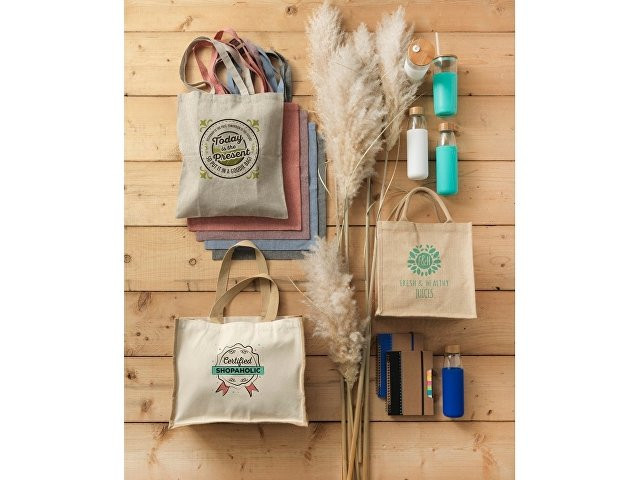 Расчет нанесенияДжутовая подарочная сумка Chennai. Джутовая сумка с ламинированным открытым основным отделением и вставкой. Хлопковые ручки высотой 11,5 см. Джут.