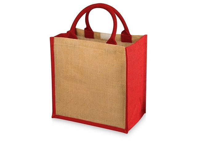 Джутовая подарочная сумка с ламинированным открытым основным отделением, которое застегивается на липучку. Хлопковые ручки высотой 11,5 см.