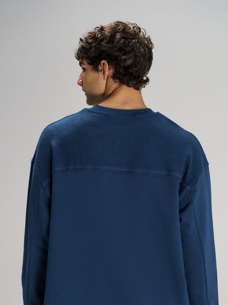 Благодаря особой конструкции, где часть деталей — перед и спинка — вывернута наизнанку, свитшот приобретает запоминающийся вид. Так внутренняя, обычно незаметная сторона материала превращается в лицевую: миниатюрные петельки бывшей изнанки становятся настоящим украшением толстовки, добавляя ей оригинальности и эффект невероятно приятной плюшевости.