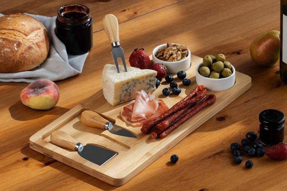 В набор входят доска из бамбука, два керамических соусника, вилка, листовидный нож для сыра твердых сортов, нож-лопатка для мягкого сыра.