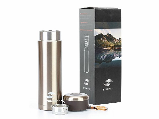 ТЕРМОКРУЖКА STINGER 0,42 Л СВОЙСТВА: Тип термоса: для горячих и холодных напитков Материал корпуса: двухслойная нержавеющая пищевая сталь 18/8 Тип крышки: закручивающаяся Материал крышки: пластиковая без бисфенола А (BPA free) Объём термоса: 0,42 л Размер термоса: 7,5 х 6,9 х 22,2 см Вес термоса: 346 г Цвет: золотой металлик ХАРАКТЕРИСТИКИ: Сохраняет температуру: Горячий напиток: через 6 часов температура наполняемой жидкости 71℃ Холодный напиток: через 6 часов температура наполняемой жидкости 7,5 ℃ ОСОБЕННОСТИ: Ситечко для заварки чая или кофе Кольцо для удобства переноски Подходит под любые автомобильные подстаканники