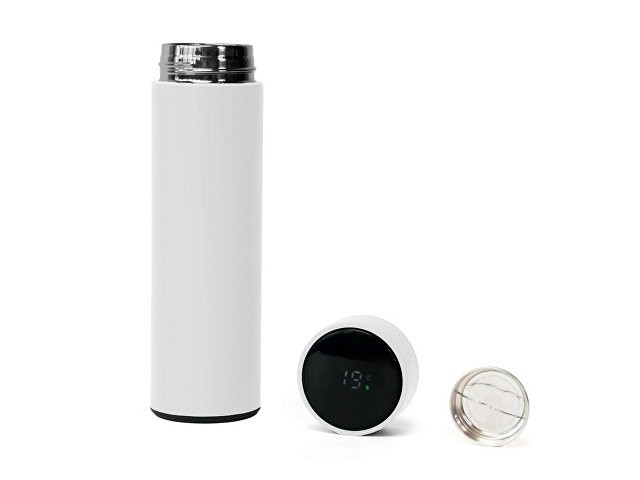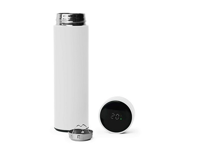 Термос из нержавеющей стали, покрытый цветным soft touch, с крышкой, в которой встроен термометр и LED дисплей, показывающий температуру внутри термоса. Объем: 500 мл. Упаковка: каждый термос в крафт коробке.