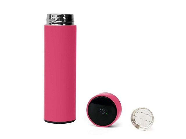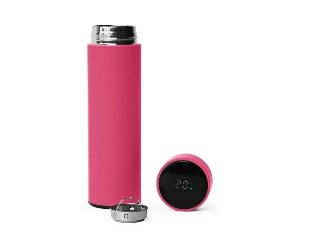 Расчет нанесенияТермос из нержавеющей стали, покрытый цветным soft touch, с крышкой, в которой встроен термометр и LED дисплей, показывающий температуру внутри термоса. Объем: 500 мл. Упаковка: каждый термос в крафт коробке.