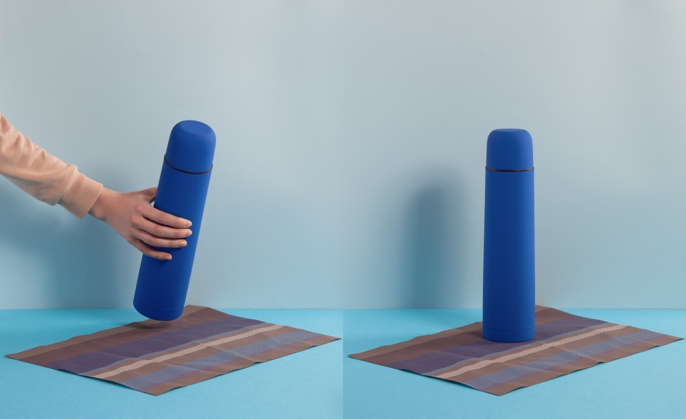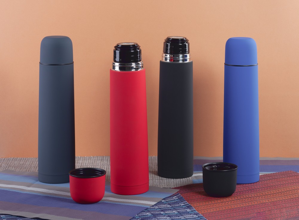 Внешняя стенка термостакана изготовлена из нержавеющей стали с уникальным прорезиненным напылением soft-touch, а внутренняя стенка выполнена из  высококачественной пищевой, нержавеющей стали. Корпус изделия персонализируется по окружности встык. Термос оснащен пробкой с клапаном, которая позволяет наливать напиток одним нажатием.
