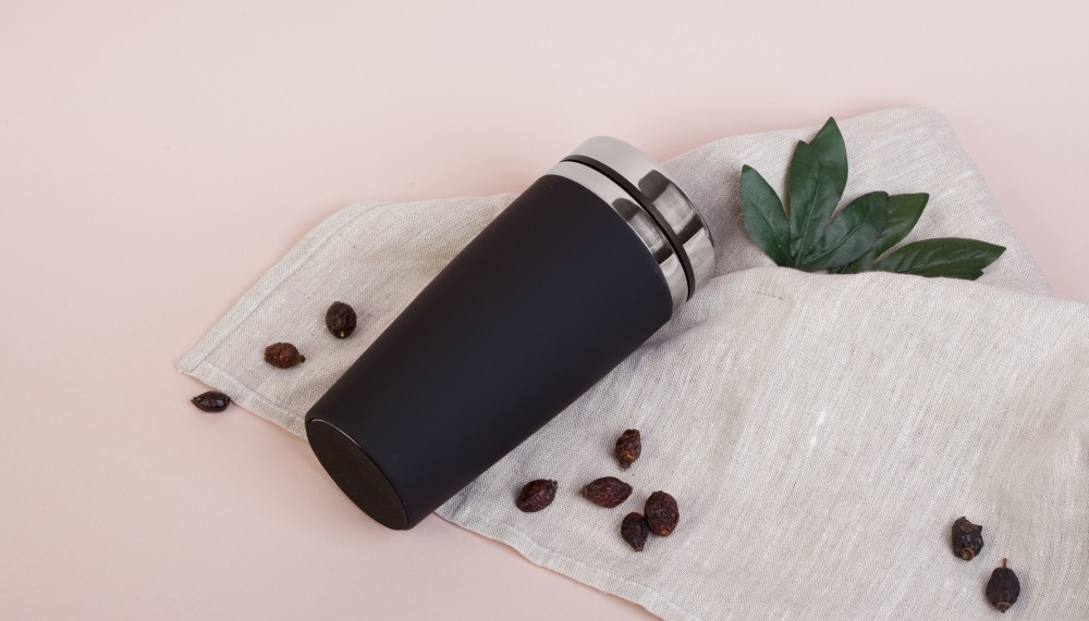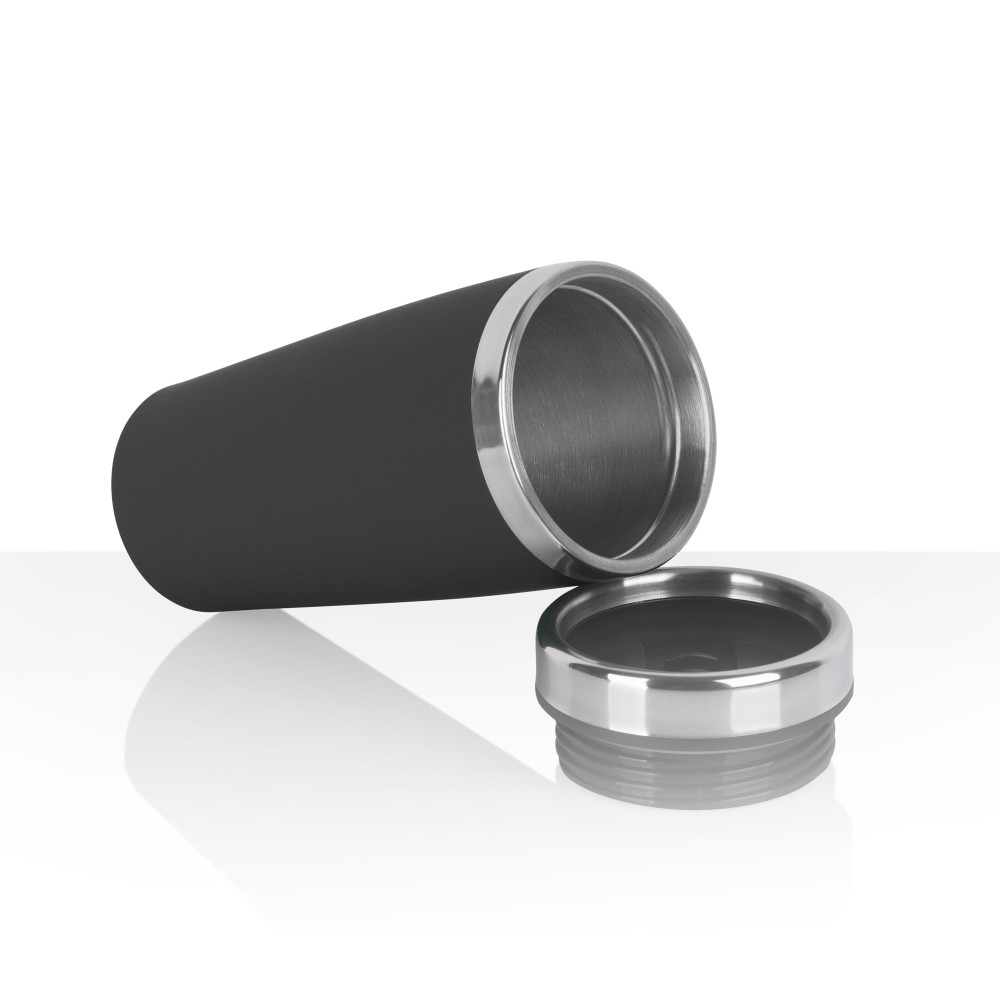 Внешняя стенка термостакана изготовлена из нержавеющей стали с уникальным прорезиненным напылением soft-touch, а внутренняя стенка выполнена из  высококачественной пищевой, нержавеющей стали. Корпус изделия персонализируется по окружности встык. У термостакана отвинчивающаяся крышка.
