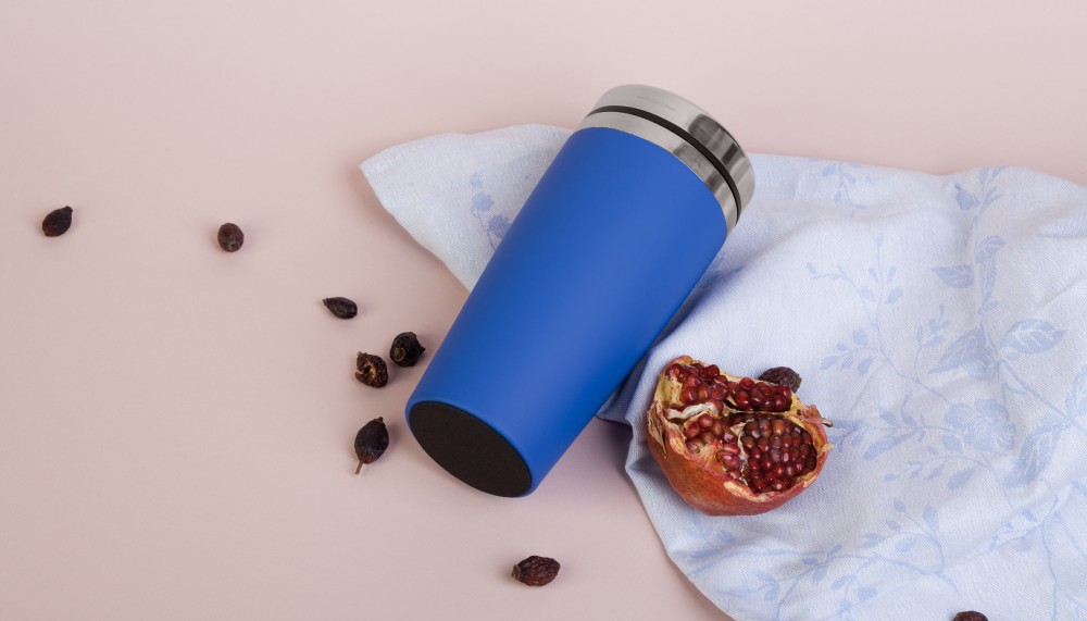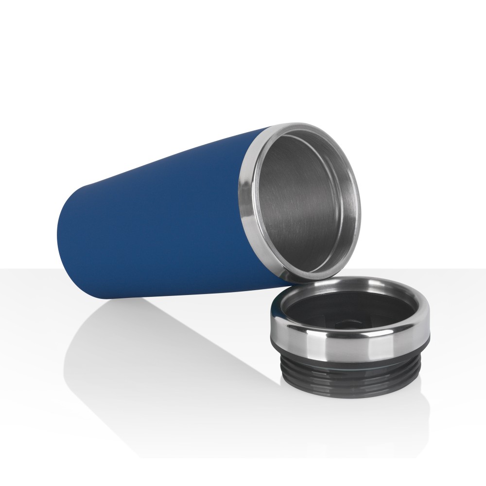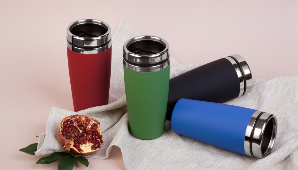 Внешняя стенка термостакана изготовлена из нержавеющей стали с уникальным прорезиненным напылением soft-touch, а внутренняя стенка выполнена из  высококачественной пищевой, нержавеющей стали. Корпус изделия персонализируется по окружности встык. У термостакана отвинчивающаяся крышка.