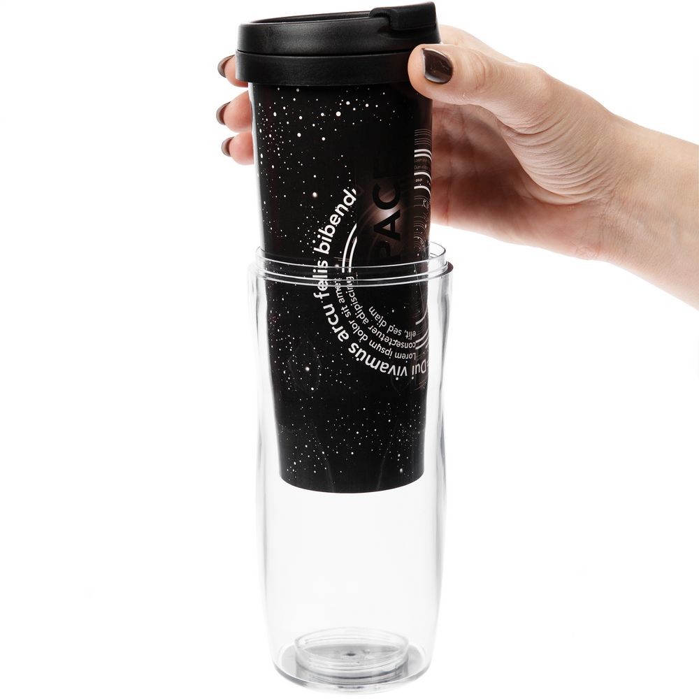 Отличный рекламоноситель с огромным полем печати — можно разместить не просто логотип, а целую историю. Полноцветная вставка занимает всю поверхность стакана и смотрится очень органично. Для сборки и разборки не требуются клей или специальные инструменты — изображение помещают в пространство между внешним и внутренним слоями корпуса, части которого скрепляют с помощью скрытого в дне стакана резьбового соединения.
