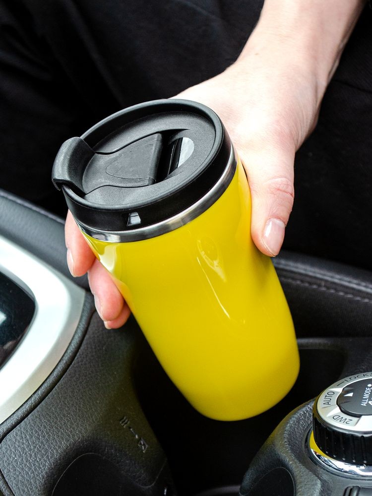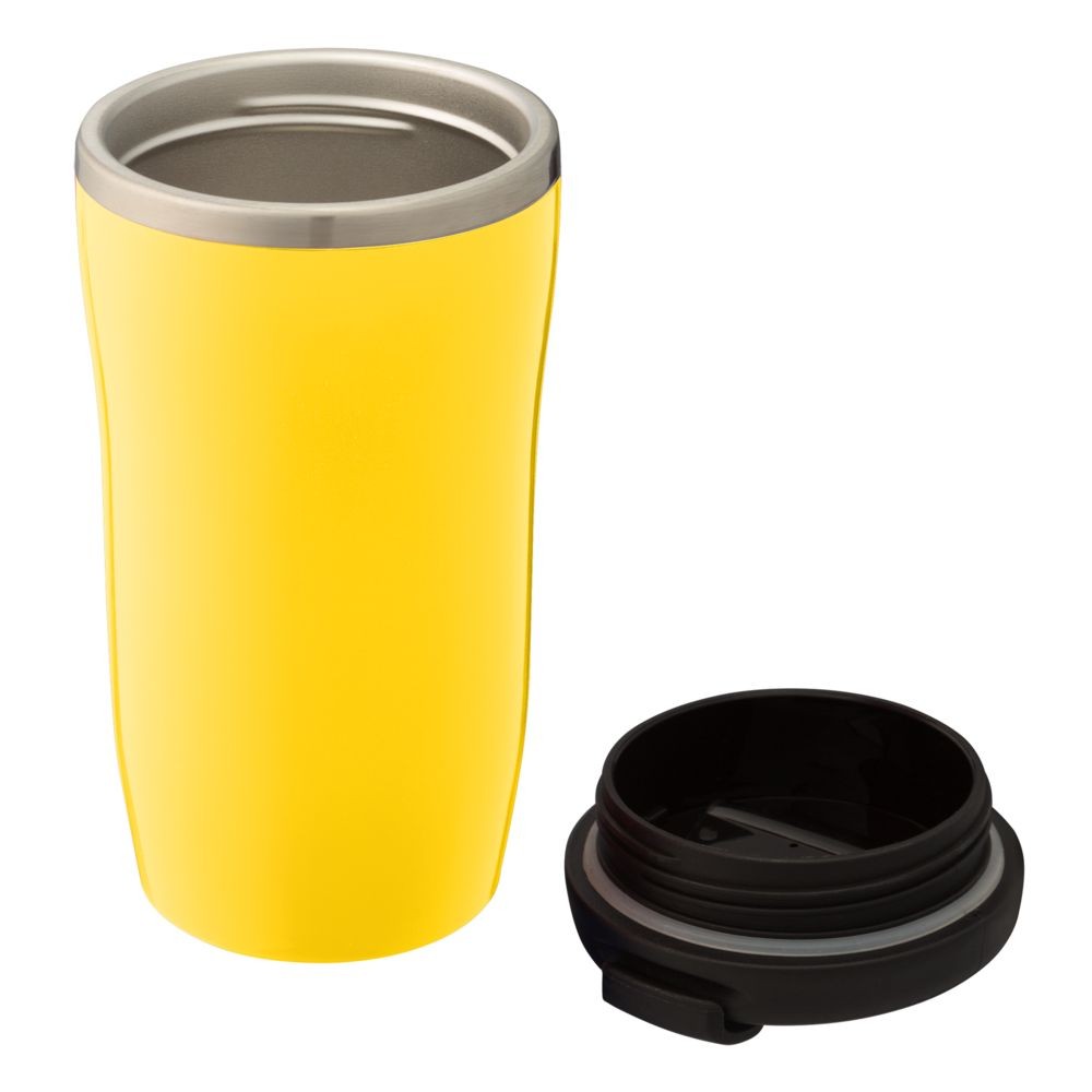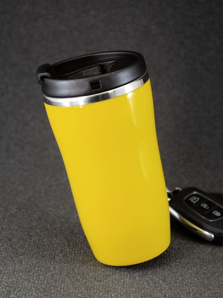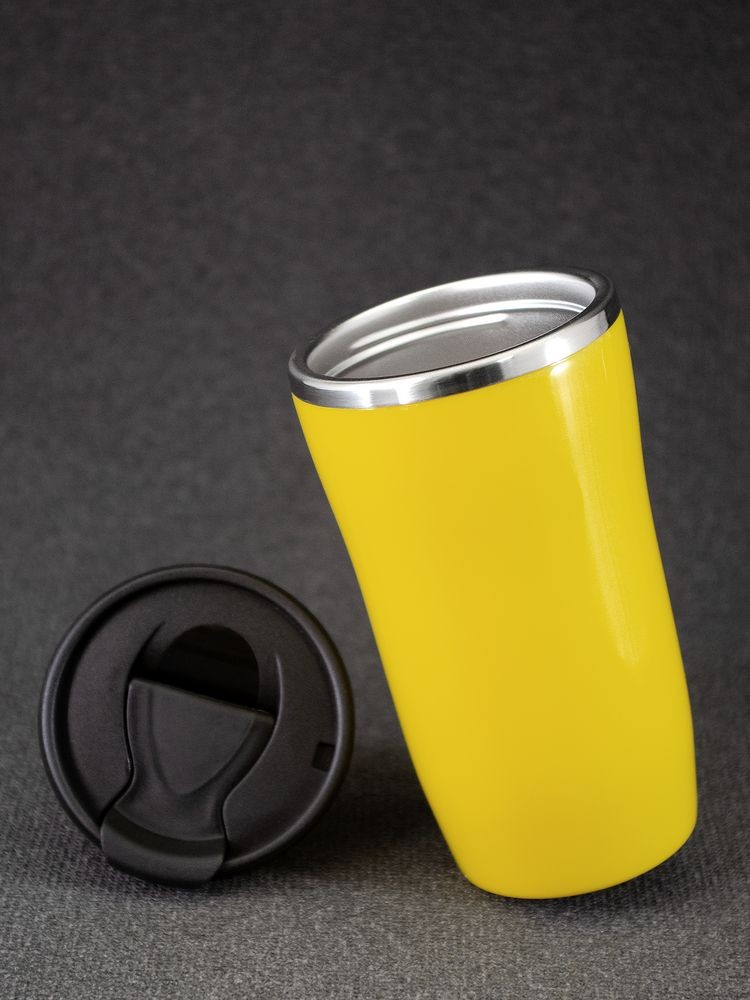 Двухслойная конструкция из пластика снаружи и пищевой нержавеющей стали внутри. Герметичная завинчивающаяся крышка с откидным клапаном для питья. В отверстие в крышке можно вставить шнурок для удобного ношения стакана на руке. Шнурок в комплект не входит.