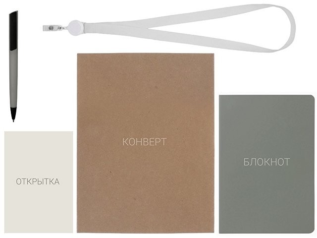 Материал: блокнот - искусственная кожа, открытка - бумага, пакет - картон, ручка - пластик с покрытием софт-тач, ланьярд с ретрактором - полиэстер, металл, пластик