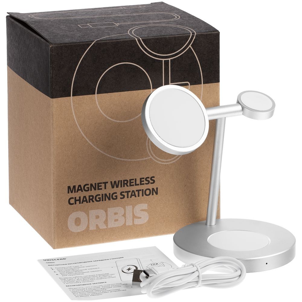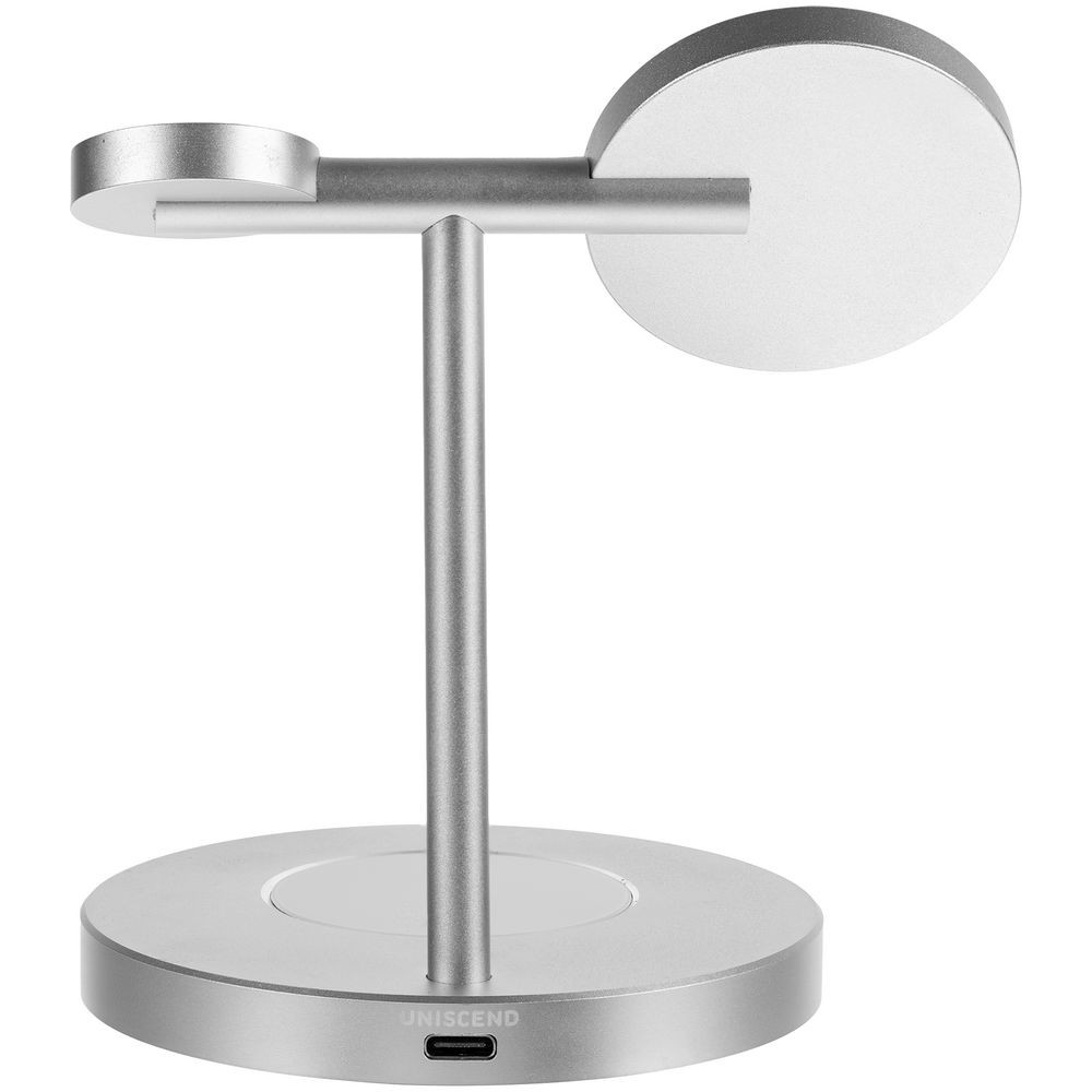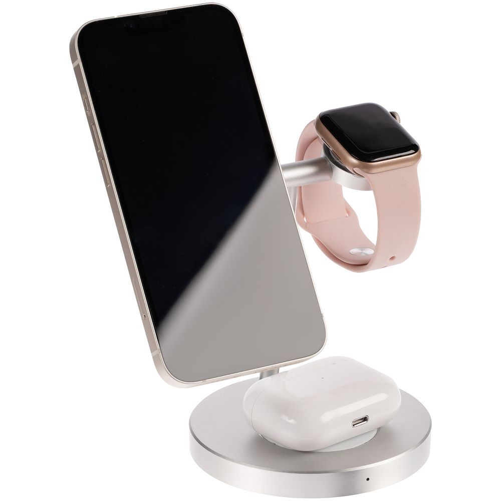 Станция может заряжать одновременно 3 устройства: беспроводные наушники с соответствующей функцией беспроводного заряда, смартфон, часы Apple Watch 2–8. Смартфоны iPhone 12–15 удерживаются на станции встроенными в их корпус магнитами. Прочие телефоны рекомендуем дополнить магнитным стикер-адаптером Magmate для надежного удержания на зарядной области.