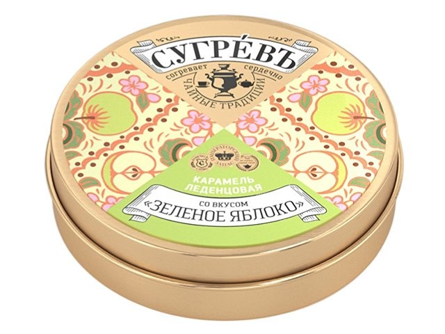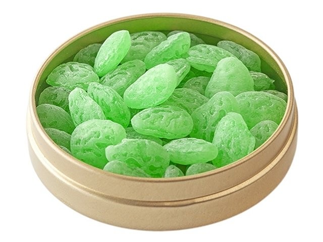 Необычная карамель в форме листика. Имеет натуральный и насыщенный вкус спелого яблока. Баночка весьма компактна, что позволяет поместить её в любой карман. Разработана по немецкой технологии. Состав: патока, вода, регуляторы кислотности (лимонная кислота, молочная кислота), ароматизаторы, идентичные натуральным, краситель: экстракт сафлора, Е131, сахар.