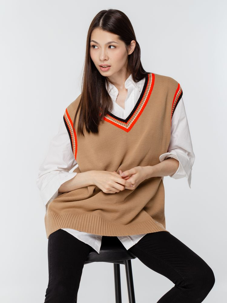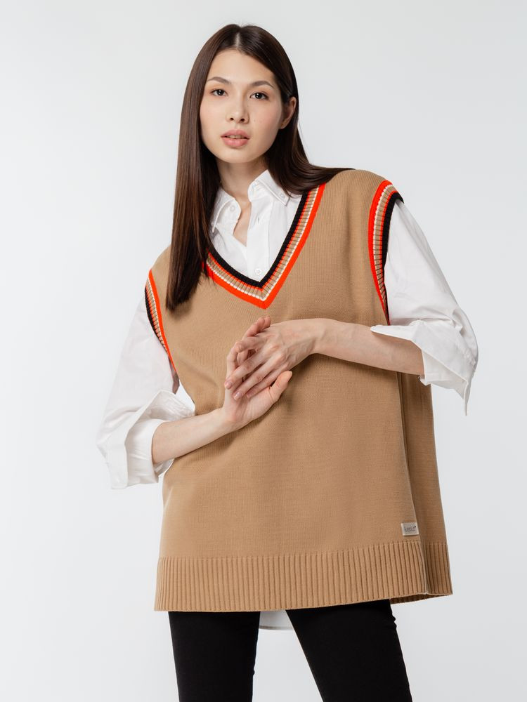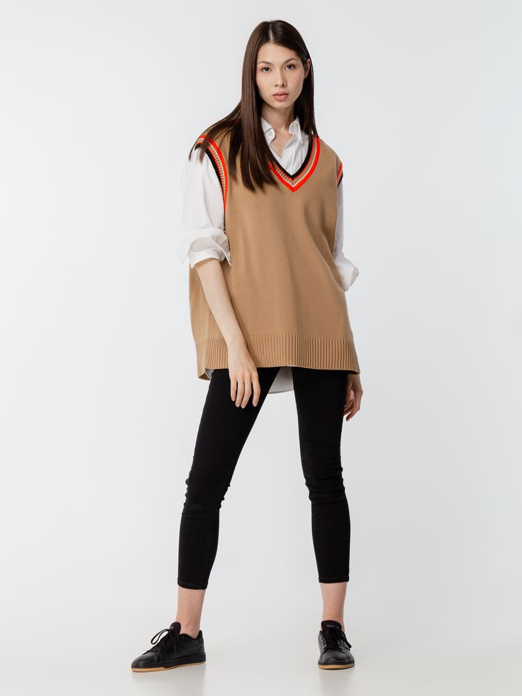 Оверсайз жилет с V-образным вырезом и цветной отделкой.В комплект к жилету прилагается легкая хлопковая сумка.
