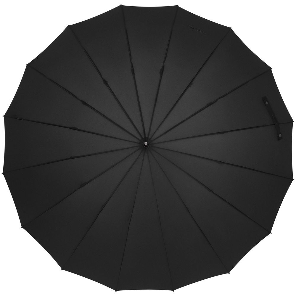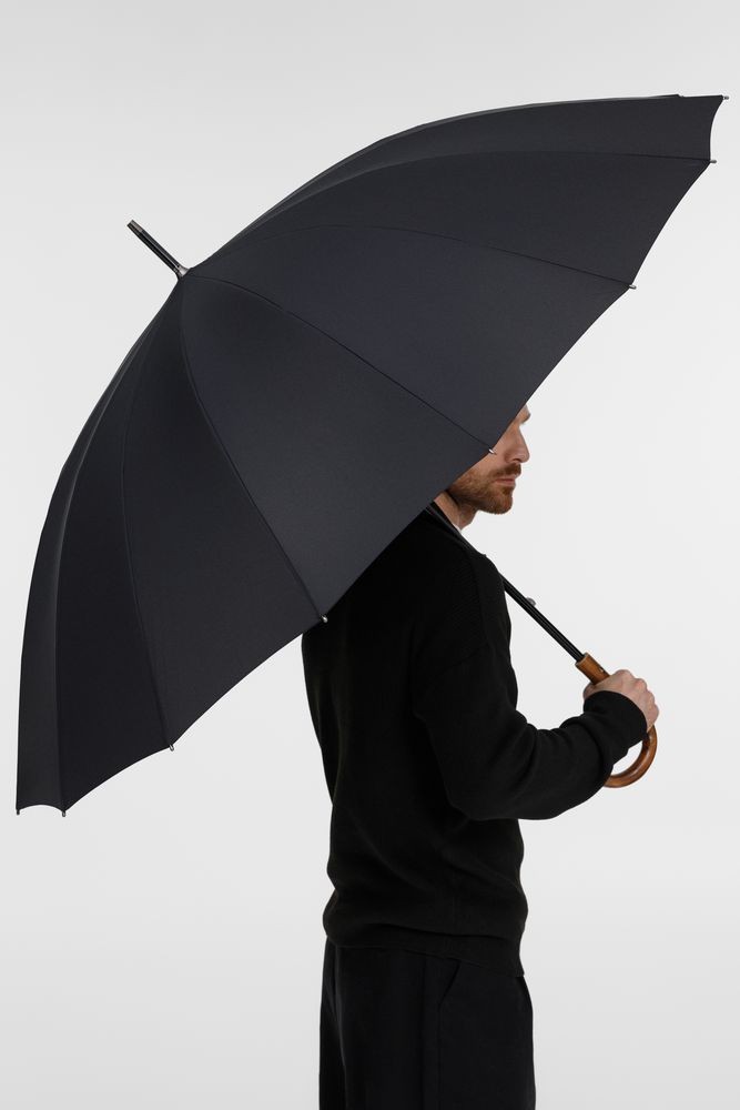 Солидный изысканный зонт с ручкой из дерева и 16 спицами. Большой купол легко укроет от дождя сразу двоих, а надежная конструкция выдержит даже сильный ветер.