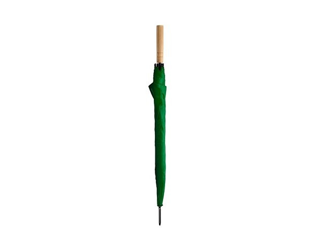 Зонт с деревянной ручкой и автоматическим открытием. Спицы и отделка черного цвета. Застежка на липучке.