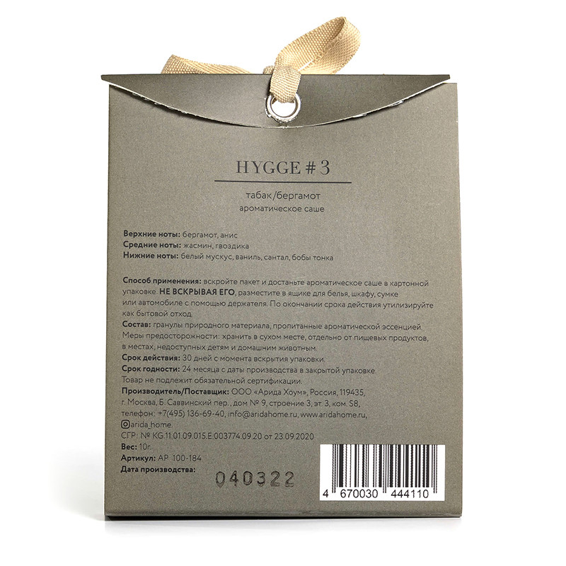 МЫ ПРЕДЛАГАЕМ НОВУЮ ЭКСКЛЮЗИВНУЮ ОПЦИЮ - АРОМАСАШЕ с уникальной коллекцией ароматов HUGGE для дополнительной кастомизации наших рюкзаков. Понятие "Hugge" пришло к нам из Дании и его сложно дословно перевести, но смысл можно передать как "состояние комфорта, уюта, счастья в простых вещах, спокойствия и наслаждения моментом. Добавьте аромасаше коллекции HUGGE пропитанные натуральными ароматическими маслами в наши рюкзаки и неуловимый аромат спокойствия и комфорта будет сопровождать вас целый день окутывая ваши вещи и нейтрализуя неприятные запахи. Модели рюкзаков, в которых есть специальные карманы для аромасаше отмечены на нашем сайте специальным значком AROMA UNI. Вы также можете использовать аромасаше коллекции HUGGE для ароматизации шкафов, одежды, белья, автомобилей. Всегда приятно возвращаться в чистый, красиво пахнущий дом или садиться в автомобиль наполненный роскошным ароматом. НОТЫ АРОМАТА: Верхние ноты: бергамот, анис Средние ноты: жасмин, гвоздика Нижние ноты: белый мускус, ваниль, сантал, бобы тонка СПОСОБ ПРИМЕНЕНИЯ: Вскройте пакет и достаньте ароматическое саше в картонной упаковке. НЕ ВСКРЫВАЯ САШЕ, разместите в ящике для белья, шкафу, сумке или автомобиле с помощью держателя. По окончании срока действия утилизируйте как бытовой отход. Меры предосторожности: хранить в сухом месте, отдельно от пищевых продуктов, в местах недоступных детям и домашним животным. СОСТАВ: Гранулы природного материала, пропитанные ароматической эссенцией СРОК ДЕЙСТВИЯ: 30 дней с момента вскрытия упаковки СРОК ГОДНОСТИ: 24 месяца с даты производства в закрытой упаковке Товар не подлежит обязательной сертификации.