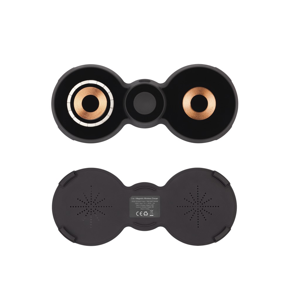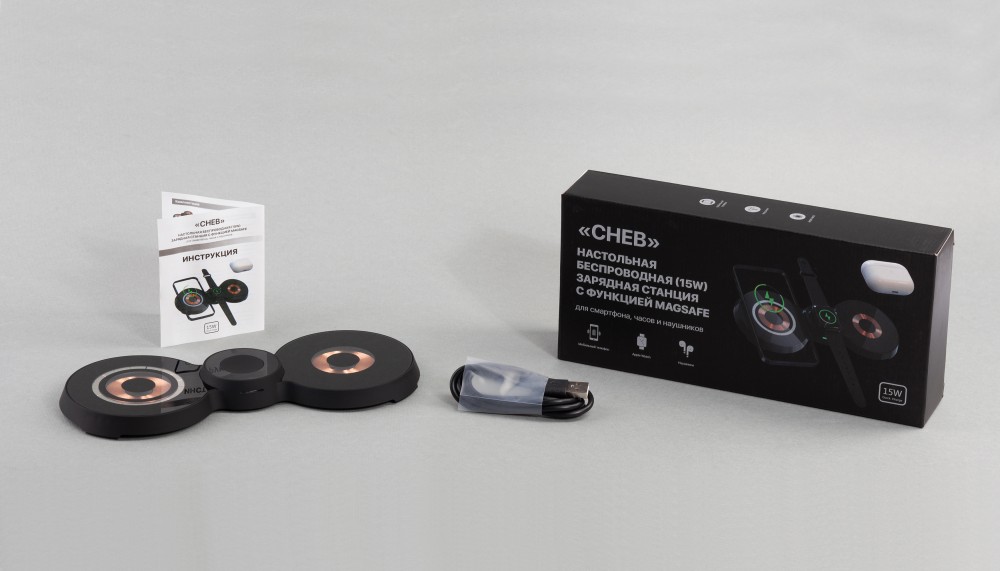 Благодаря прозрачному корпусу видны две зарядные оранжевые катушки повышенной мощности 15W и серебристое магнитное кольцо MagSafe, позволяющее удобно размещать iPhone 12 серии и выше. В центре станции - зарядный блок для смарт-часов.