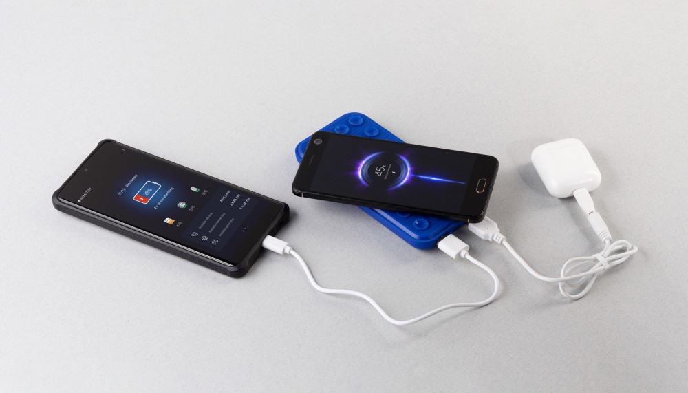 "Sticky SOFTTOUCH" - современный пауэрбанк оптимальной ёмкости с корпусом в приятно тактильном, бархатистом покрытии soft touch. Функционал позволяет одновременно заряжать до 3х гаджетов: два - проводным способом (благодаря двум USB-выходам) и один - беспроводным способом по Qi-стандарту. Несомненным удобством в конструкции является наличие присосок, позволяющих удобно разместить телефон на пауэрбанке во время беспроводной зарядки. Дополняет образ яркая персонализация - эффектная подсветка логотипа, включающаяся во время зарядки гаджетов.