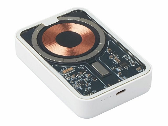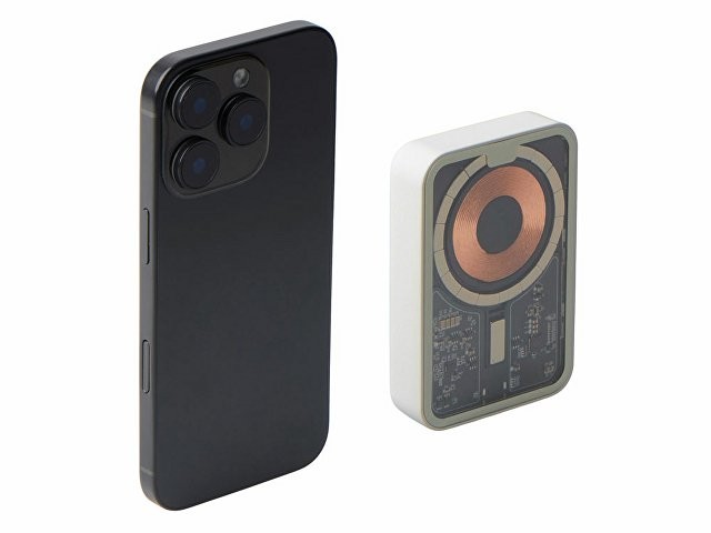 Беспроводной магнитный внешний аккумулятор MagnifIQ — технологичный и стильный power bank с эффектной прозрачной передней панелью, сквозь которую видны мощные магниты, индукционная катушка и электронная начинка. Ёмкость 10 000 мА·ч обеспечивает до 2–3 полных зарядов смартфона, а поддержка быстрой беспроводной зарядки до 15 Вт (с совместимостью QC/PD) делает процесс зарядки максимально быстрым и удобным. Двунаправленный USB-C порт позволяет как заряжать другие устройства, так и сам аккумулятор. Обе стороны корпуса подходят для нанесения логотипа: лицевая — через прозрачную панель, задняя — на приятное на ощупь soft-touch покрытие. Компактный, надёжный и сильный — идеальный технологичный продукт для продвижения и ежедневного использования. Поставляется в качественной упаковке с шубером, Двунаправленный кабель USB-C и кабель USB-A – USB-C в комплекте. • Прозрачная передняя панель — демонстрирует внутреннюю «начинку» и подчеркивает технологичность бренда. • Магнитная беспроводная зарядка 15 Вт • Ёмкость 10 000 мА·ч — хватает на несколько полных зарядов смартфона. • Двунаправленный USB-C — универсальность для зарядки и подзарядки. • Две зоны нанесения логотипа: на прозрачную панель спереди и на soft-touch покрытие сзади. • Сильные магниты обеспечивают надёжную фиксацию на совместимых устройствах.
