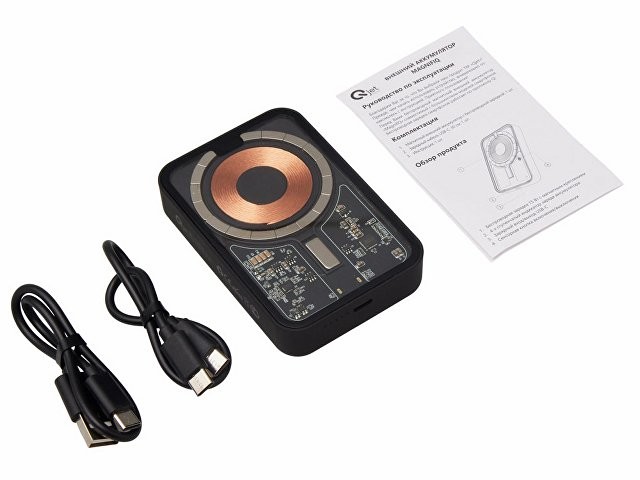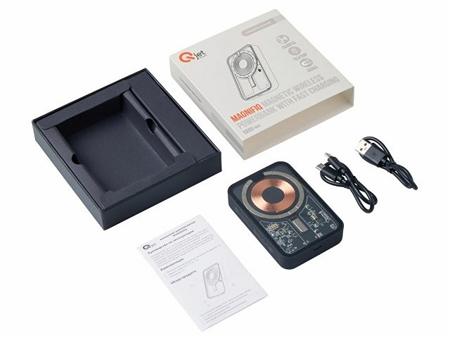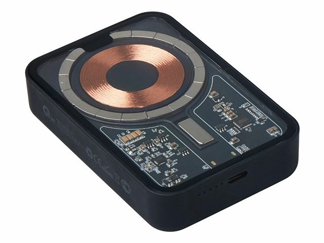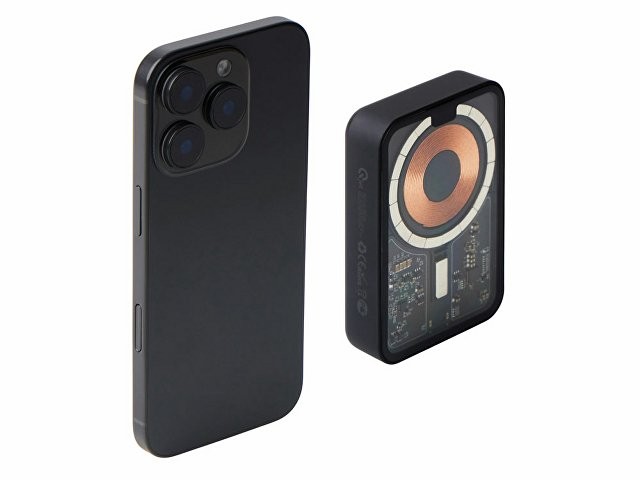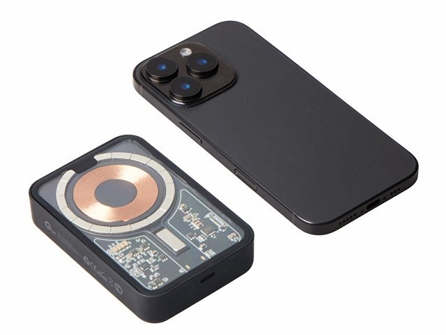 Беспроводной магнитный внешний аккумулятор MagnifIQ — технологичный и стильный power bank с эффектной прозрачной передней панелью, сквозь которую видны мощные магниты, индукционная катушка и электронная начинка. Ёмкость 10 000 мА·ч обеспечивает до 2–3 полных зарядов смартфона, а поддержка быстрой беспроводной зарядки до 15 Вт (с совместимостью QC/PD) делает процесс зарядки максимально быстрым и удобным. Двунаправленный USB-C порт позволяет как заряжать другие устройства, так и сам аккумулятор. Обе стороны корпуса подходят для нанесения логотипа: лицевая — через прозрачную панель, задняя — на приятное на ощупь soft-touch покрытие. Компактный, надёжный и сильный — идеальный технологичный продукт для продвижения и ежедневного использования. Поставляется в качественной упаковке с шубером, Двунаправленный кабель USB-C и кабель USB-A – USB-C в комплекте. • Прозрачная передняя панель — демонстрирует внутреннюю «начинку» и подчеркивает технологичность бренда. • Магнитная беспроводная зарядка 15 Вт • Ёмкость 10 000 мА·ч — хватает на несколько полных зарядов смартфона. • Двунаправленный USB-C — универсальность для зарядки и подзарядки. • Две зоны нанесения логотипа: на прозрачную панель спереди и на soft-touch покрытие сзади. • Сильные магниты обеспечивают надёжную фиксацию на совместимых устройствах.
