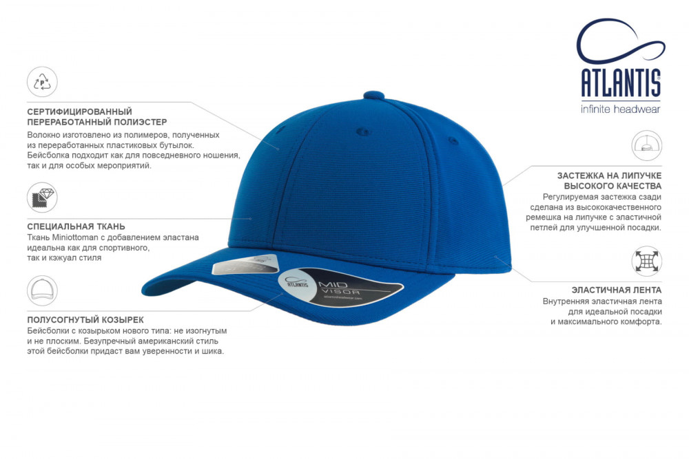 Бейсболка SAND 230 из переработанного полиэстера, 6 клиньев, застежка на липучке, Синий