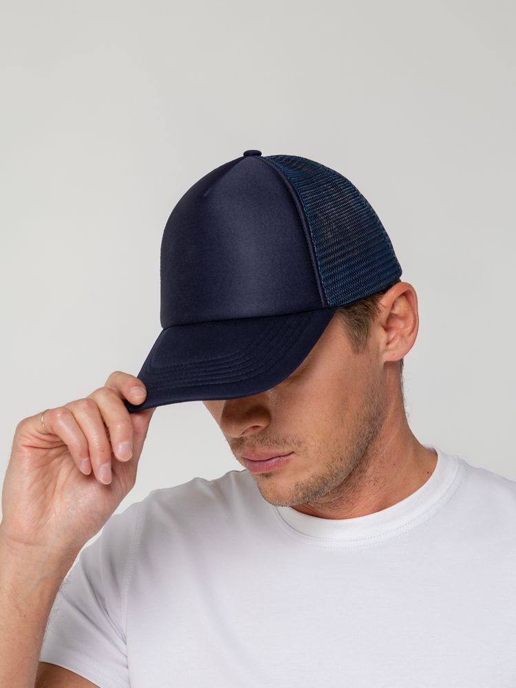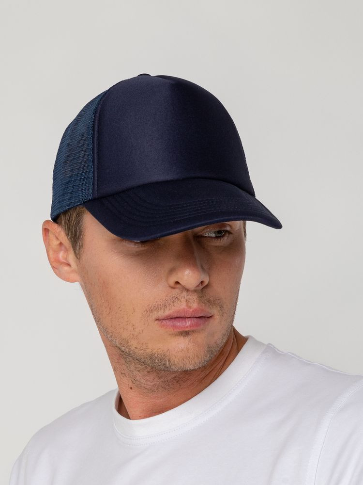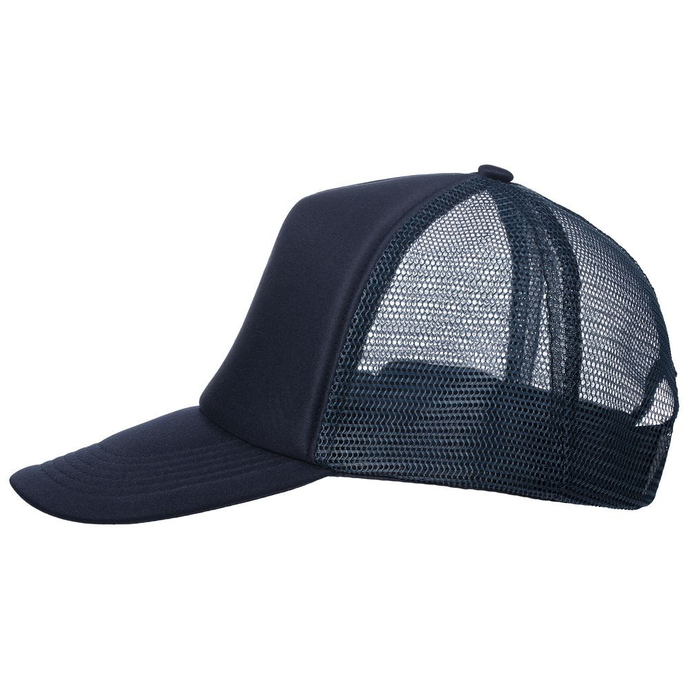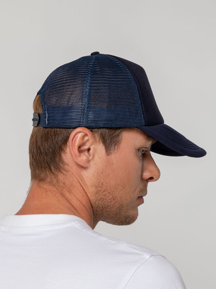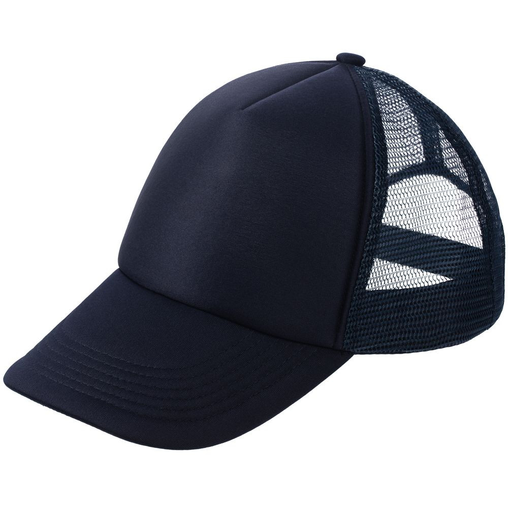 Стандартная модель с 5 клиньями без лобового шва в нестандартном исполнении. Передний клин и козырек выполнены из полиэстера с наполнителем из поролона, боковые и задние клинья — из сетки. Размер регулируется с помощью пластиковой застежки.