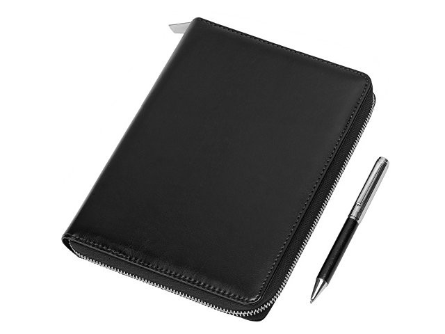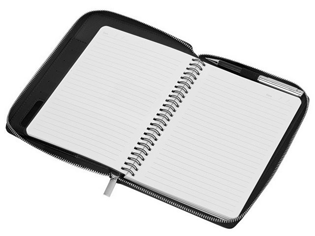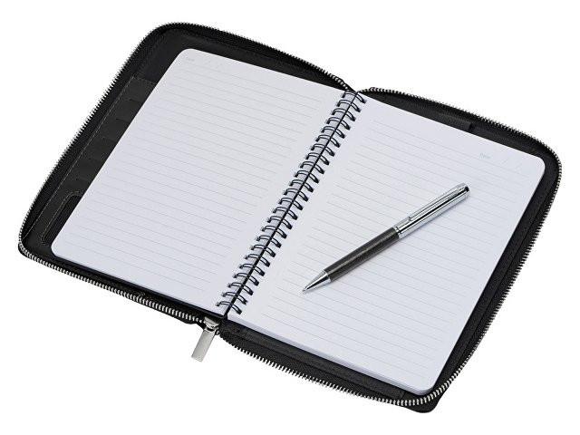 Бизнес блокнот Fabrizio состоит из пенала на молнии выполненного из искусственной кожи, и сменной тетради на 80 листов на кольцах с перфорированными линованными листами белого цвета. Блокнот снабжен 5 отделениями для карт и RFID защитой, которая охраняет вашу личную и финансовую информацию от мошенников. В комплекте идет ручка, подходящая блокноту по стилю и цвету.