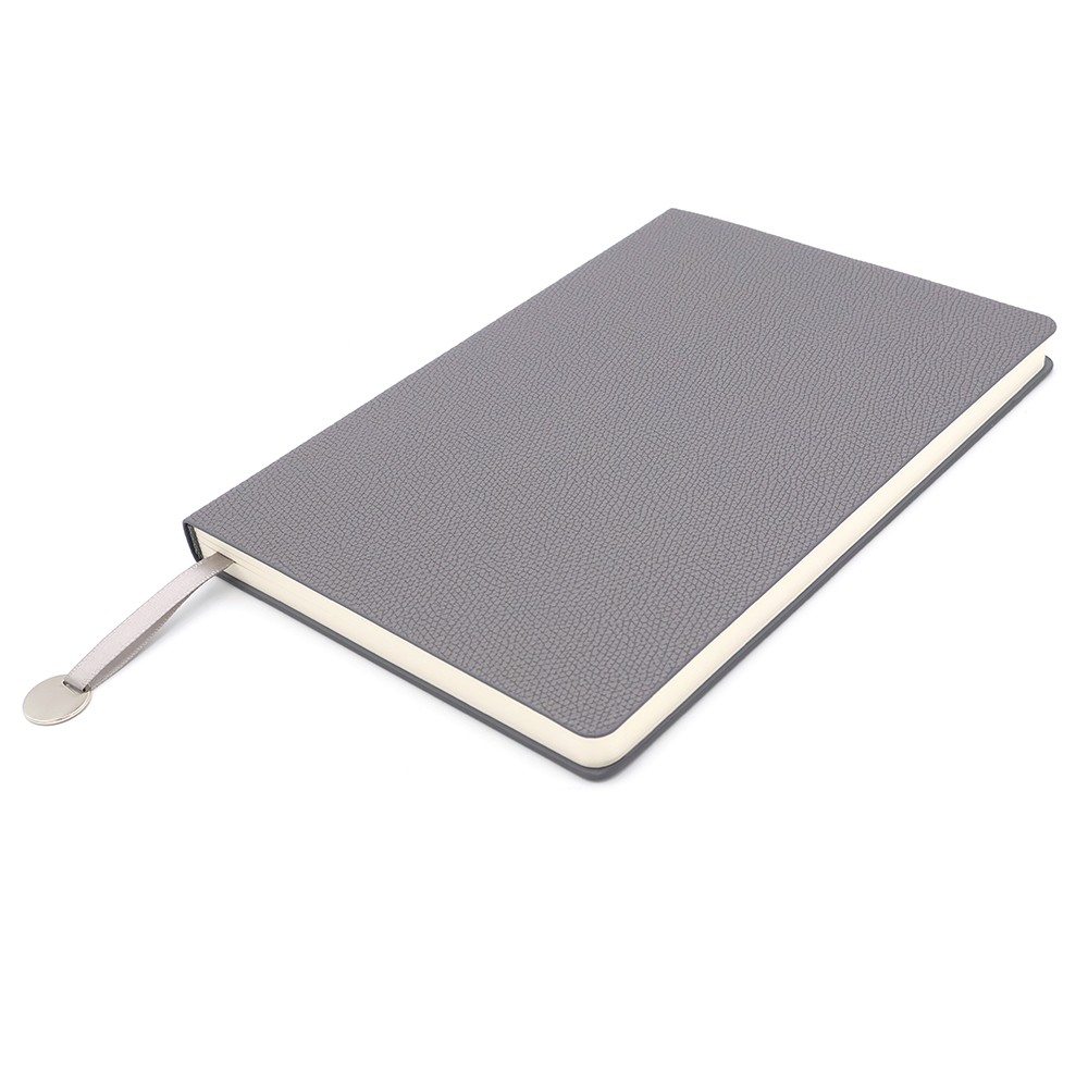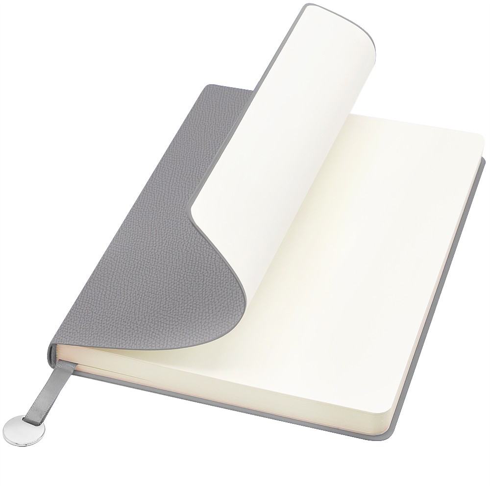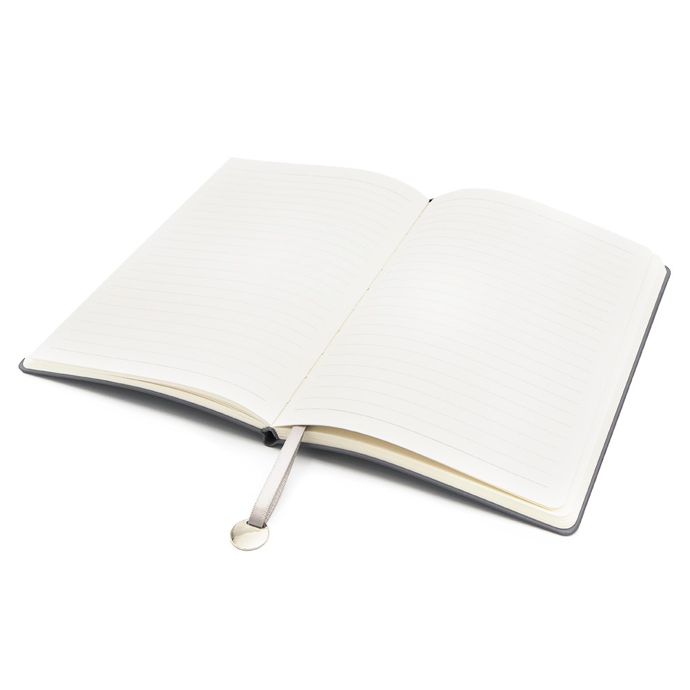 Блокнот формата А5 в гибкой обложке из искусственной кожи. Материал обложки — полиуретан. Ляссе и каптал блокнота соответствует цвету обложки. На конце ляссе присутствует металлический жетон, куда можно заказать гравировку логотипа организации. Размеры: 210*147*13 мм, 256 страниц / 128 листов, страницы в линейку, плотность бумаги — 70г/м2.