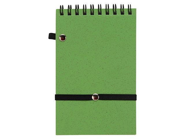 Блокнот с обложкой из переработанной пшеницы и пластика. Блок состоит из 60 листов переработанной бумаги белого цвета. Крепление - пружина. Дополнен петлей для ручки и горизонтальной резинкой.