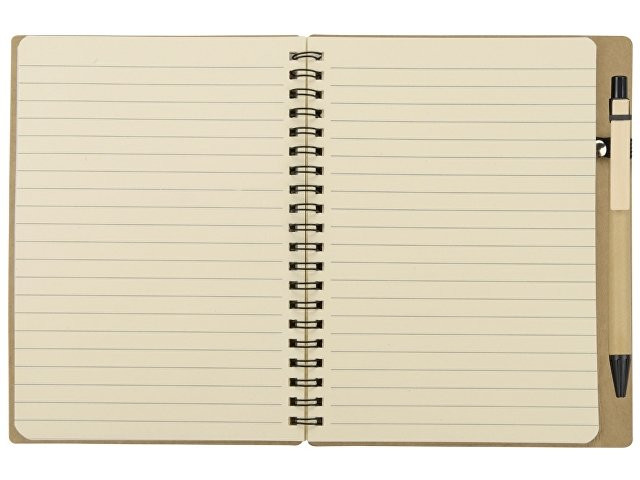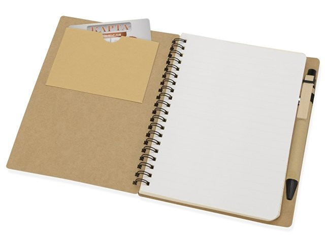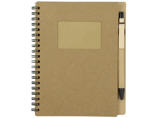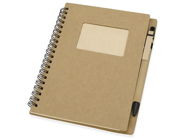 Блокнот «Дейзи» сделан из бумаги и картона и переплетен на пружине. В обложке блокнота предусмотрено окошко 8,3 х 4,7 см, в которое можно поместить визитную карточку или полиграфическую вставку размером 9 х 5,8 см. В комплекте с блокнотом идет ручка, которая вставляется в петельку сбоку. Блокнот с ручкой «Дейзи» – универсальный сувенир в эко-стиле.