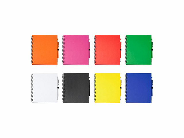 Блокнот на спирали с простыми листами и держателем для ручек. Твердая обложка и ручка из переработанного картона. 70 листов.