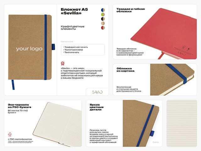 Sevilia от Savio — блокнот с твердой обложкой из крафта, закрывающийся на вертикальную резинку. Для удобства использования предусмотрены ляссе и петелька для ручки, совпадающие по цвету с резинкой. Бумажный блок выполнен из бумаги, полученной из древесины из специальных восполняемых лесных ресурсов, имеет сертификат FSC, международной некоммерческой организации лесного попечительского совета. Линовка — линия, выполнена специальными экочернилами, при изготовлении которых используется меньшее количество энергии. - 80 листов - твердая обложка обеспечивает защиту бумажного блока и прочность конструкции - бумага из восполняемых лесных ресурсов - петелька для ручки - экочернила - ляссе обложки для быстрой навигации