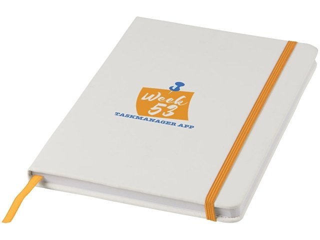 Расчет нанесенияБелый блокнот A5 с цветной эластичной закладкой и резинкой. 96 страниц (60g/m2), линованная бумага. На обложке возможна цифровая печать.
