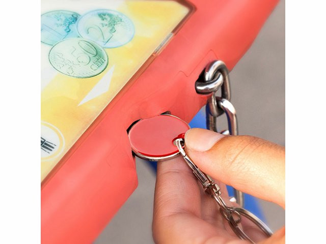 Металлический брелок с цветной эмалью в форме монеты для тележки супермаркета.