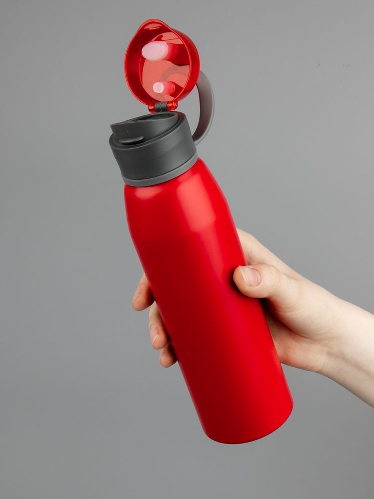 Легкая бутылка для спорта с откидной крышкой и силиконовой петлей для удобной транспортировки.