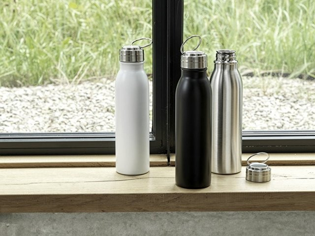 Одностенная бутылка для воды из нержавеющей стали, сертифицированной RCS, с завинчивающейся герметичной крышкой и прочной петлей для переноски из цинкового сплава. Не содержит БФА, протестирована и одобрена в соответствии с немецким законодательством о безопасности пищевых продуктов (LFGB). Проверена на содержание фталатов и одобрена для использования в соответствии с правилами REACH. Подходит для большинства стандартных автомобильных подстаканников. Объем 700 мл. Рекомендуется мыть вручную. Поставляется в подарочной коробке из переработанного картона. Recycled stainless steel, Recycled PP Plastic. Packaging: FSC Mix Credit P5.1 CU-COC-877277.