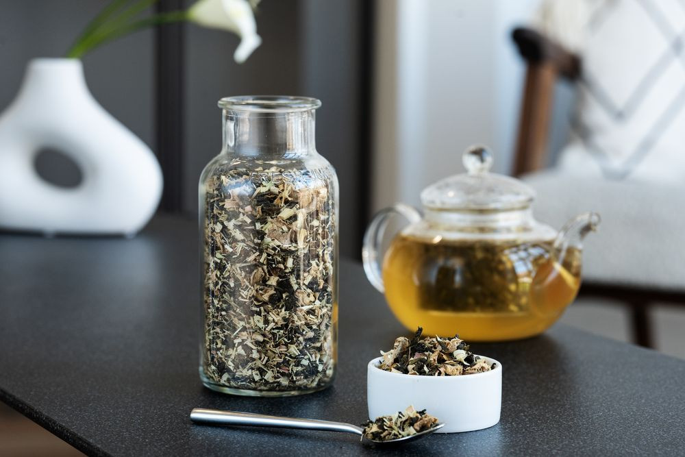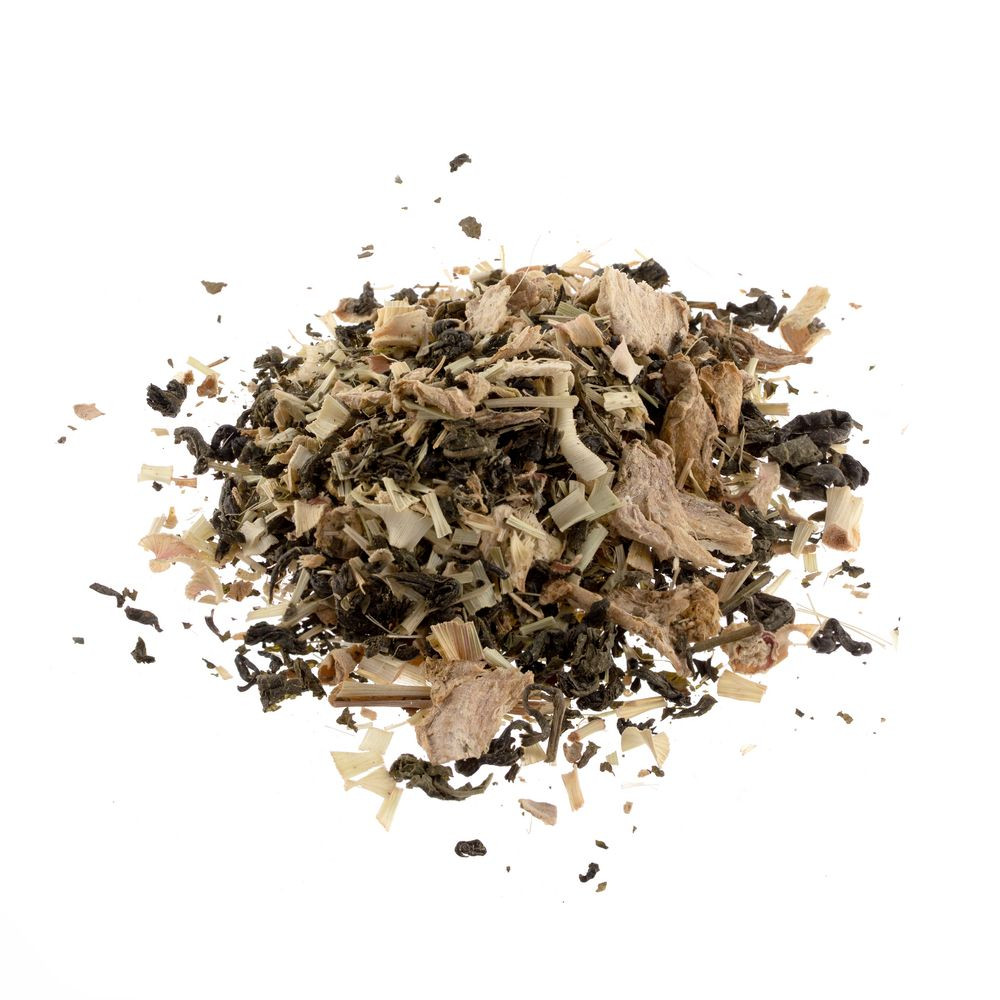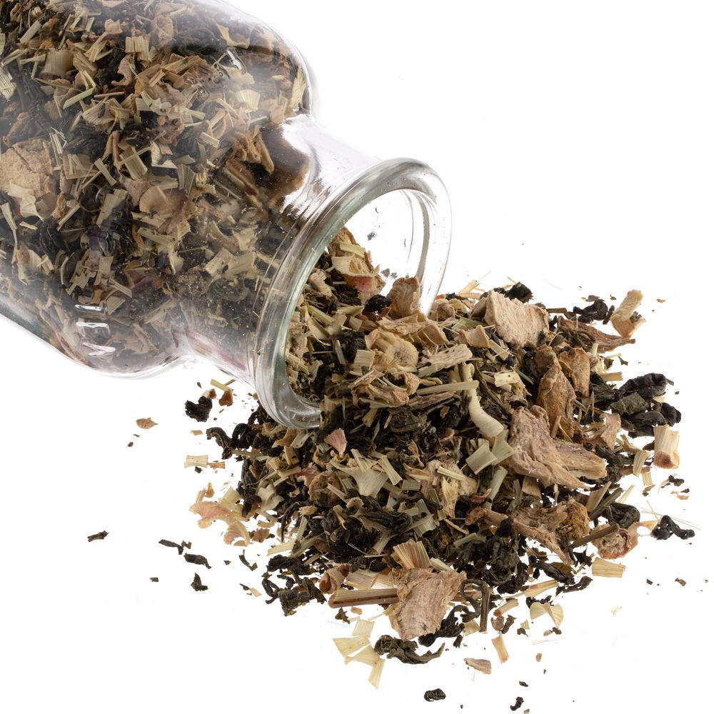 Состав: чай зеленый байховый крупнолистовой, кусочки имбиря, сок имбиря, лемонграсс. Поставляется в стеклянной бутылке с пробкой.