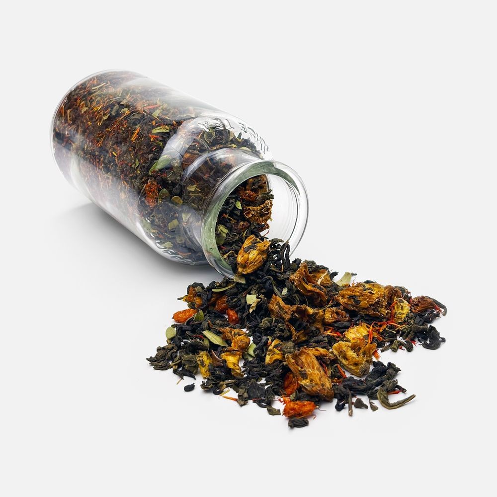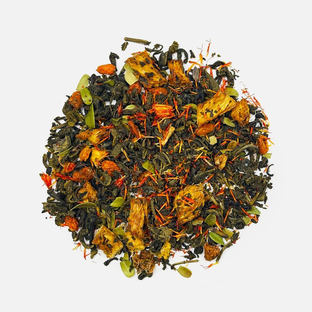 Вес нетто: 60 гСостав: чай зеленый с ананасом и соком ананаса (чай зеленый байховый крупнолистовой, кусочки ананаса, сок ананаса), цветки сафлора, толокнянка, облепиха сублимированная, ароматизатор натуральный Персик, ароматизатор натуральный Груша.