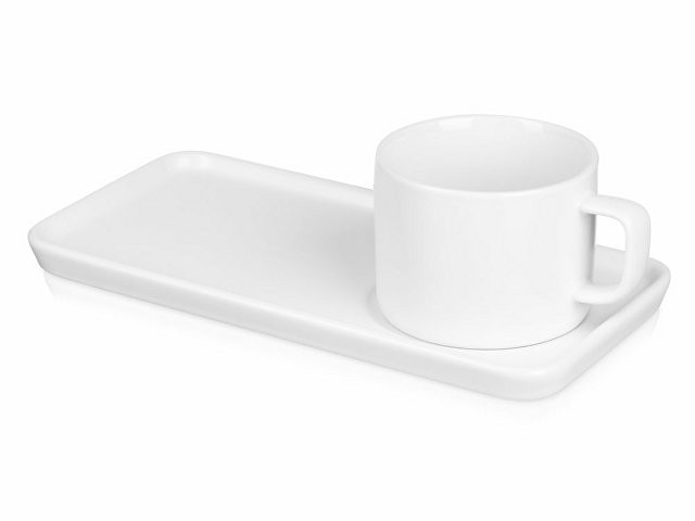 Чайная пара с необычным прямоугольным блюдцем — на нем хватит места не только для чашки, но и для пирожного. Весь силуэт этого комплекта — лаконичный, строгий, прямоугольный, что создает прекрасный фон для нанесения логотипа. Удобство этой чайной пары еще и в том, что для чашки предусмотрена отдельная ниша, которая не даст ей соскользнуть. - большое блюдце необычной формы с местом для чайного пакетика или печенья - кружка белая с двух сторон - удобная ручка - костяной фарфор
