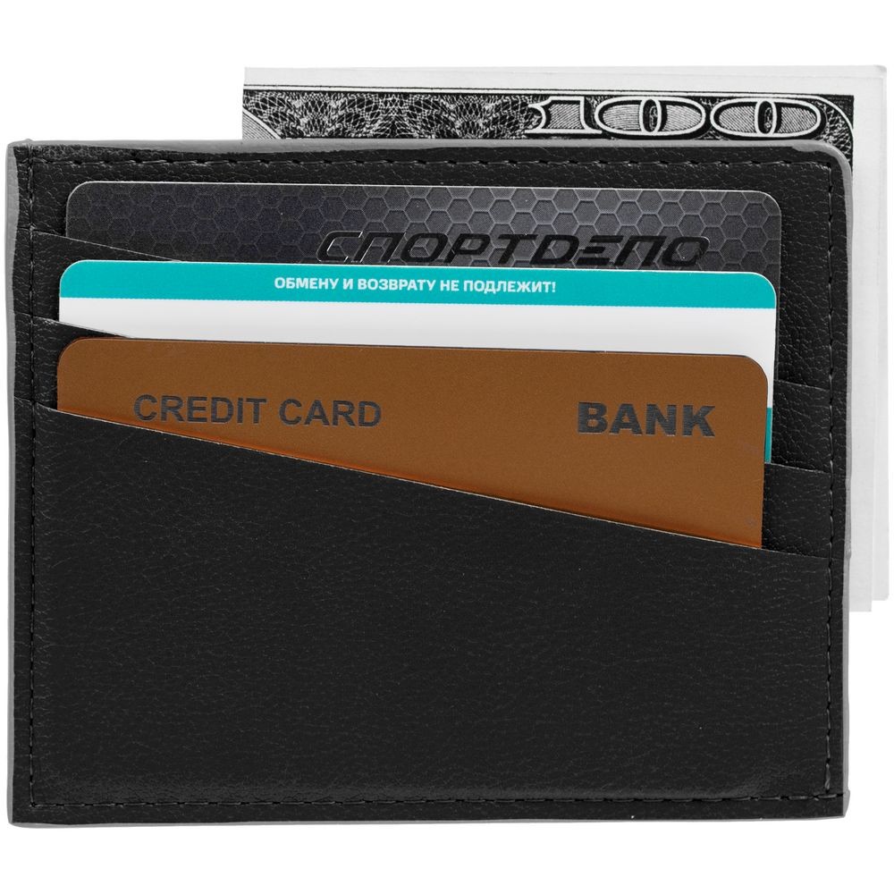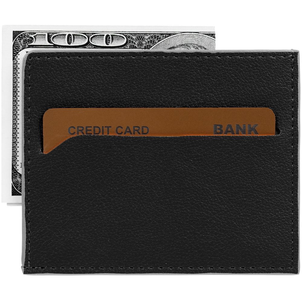 Чехол выполнен из материала Petrus, черный АА, дополнен окрашенным срезом края и внутренним карманом из серого картона. Имеет 4 отделения для кредитных карт и 1 отделение для купюр.